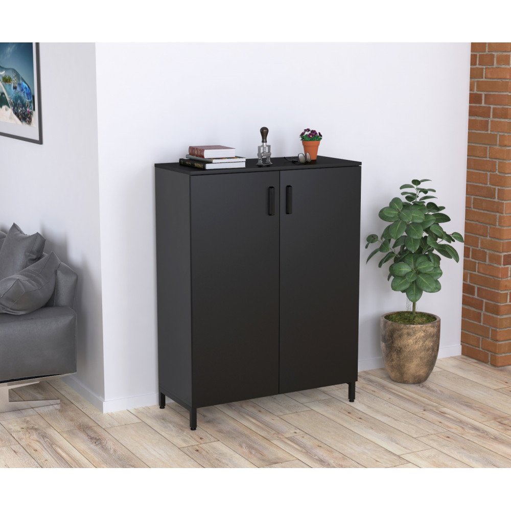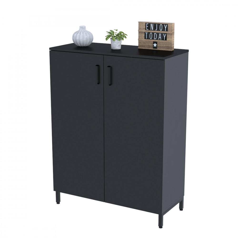LT-900-1200 антрацит - это классическая высокая офисная тумба с двумя дверями и тремя полками внутри. Однако она имеет некоторые отличительные особенности, которые выделяют её среди аналогов. Это металлические опоры, которые придают внешне лёгкость и необычность, а также двухцветная расцветка, которая делает акцент на красивых фасадах и в тоже время отводит взгляд от громоздкого каркаса.