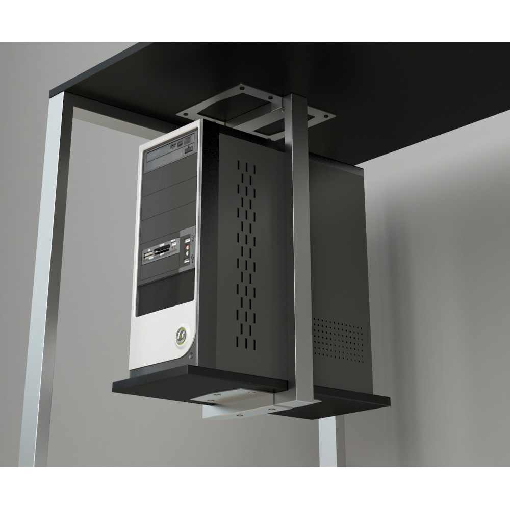 Тримач системного блоку SB-1 призначений для кріплення системного блоку типу Мінітауер. Він підійде практично до будь-якого столу, тому що кріпиться безпосередньо до стільниці. Тримач складається з металевих деталей (рамки та кріпильних пластин) та полиці з ДСП.