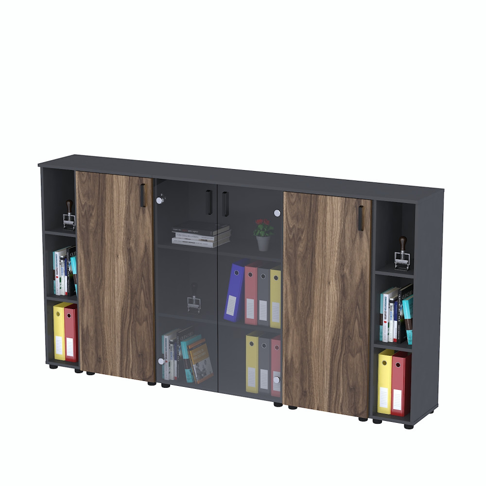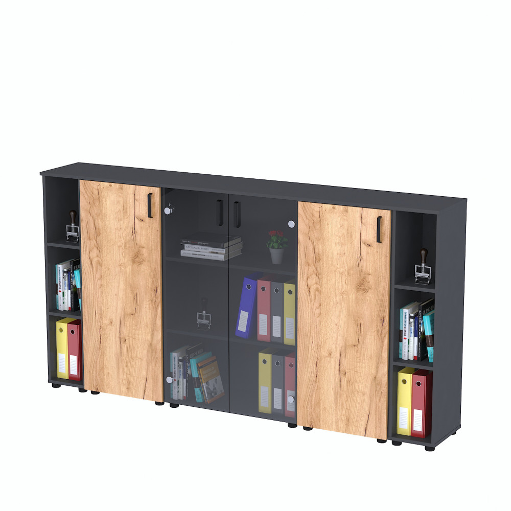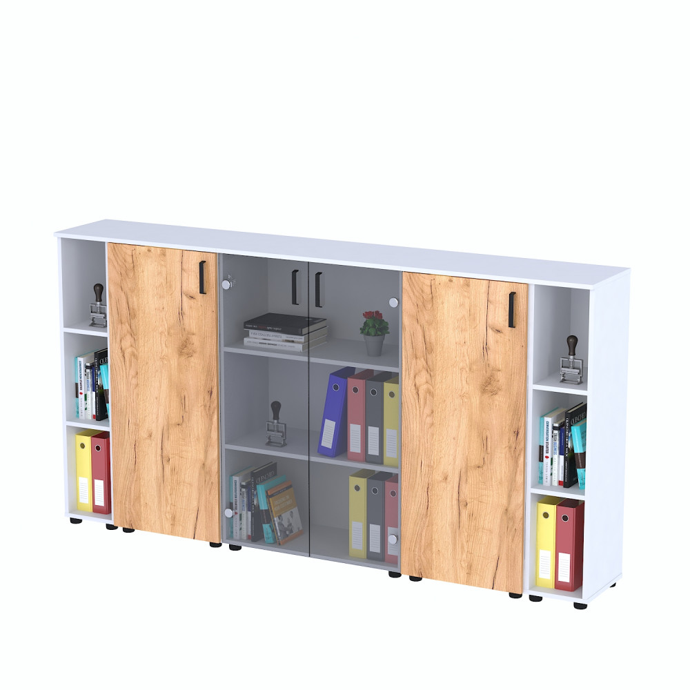 Комплект шаф №1 — практичне і стильне рішення для організації зберігання в офісі або домашньому кабінеті. Він поєднує відкриті, закриті та скляні секції, що забезпечують зручний доступ до необхідних речей і допомагають підтримувати порядок у приміщенні.