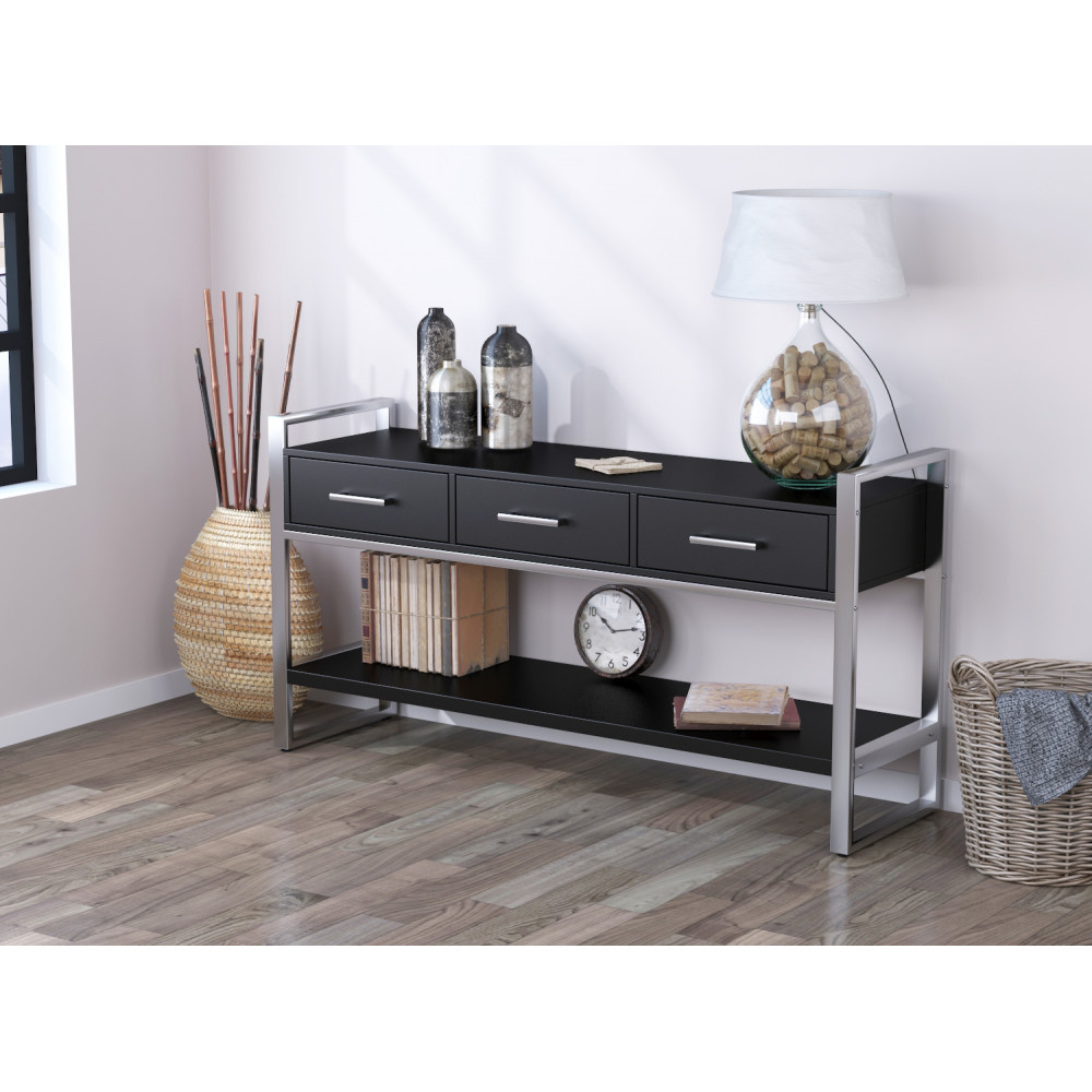 Тумба консолі виконана з преміального ЛДСП товщиною 18 мм. На робочих поверхнях використовується кромка ПВХ завтовшки 2 мм. Консоль має три висувні шухляди. Шухляди рухаються на телескопічних напрямних. Фасади оснащені металевими ручками-скобами. Каркас виготовлено з металевих труб профілем 40*20, 20*20 і 15*15 мм. Збірка здійснюється за допомогою гвинтів. Внизу опор встановлені регульовані ніжки, для того, щоб можна було виставити консоль на нерівній підлозі. Консоль має дуже солідний і сучасний вигляд.