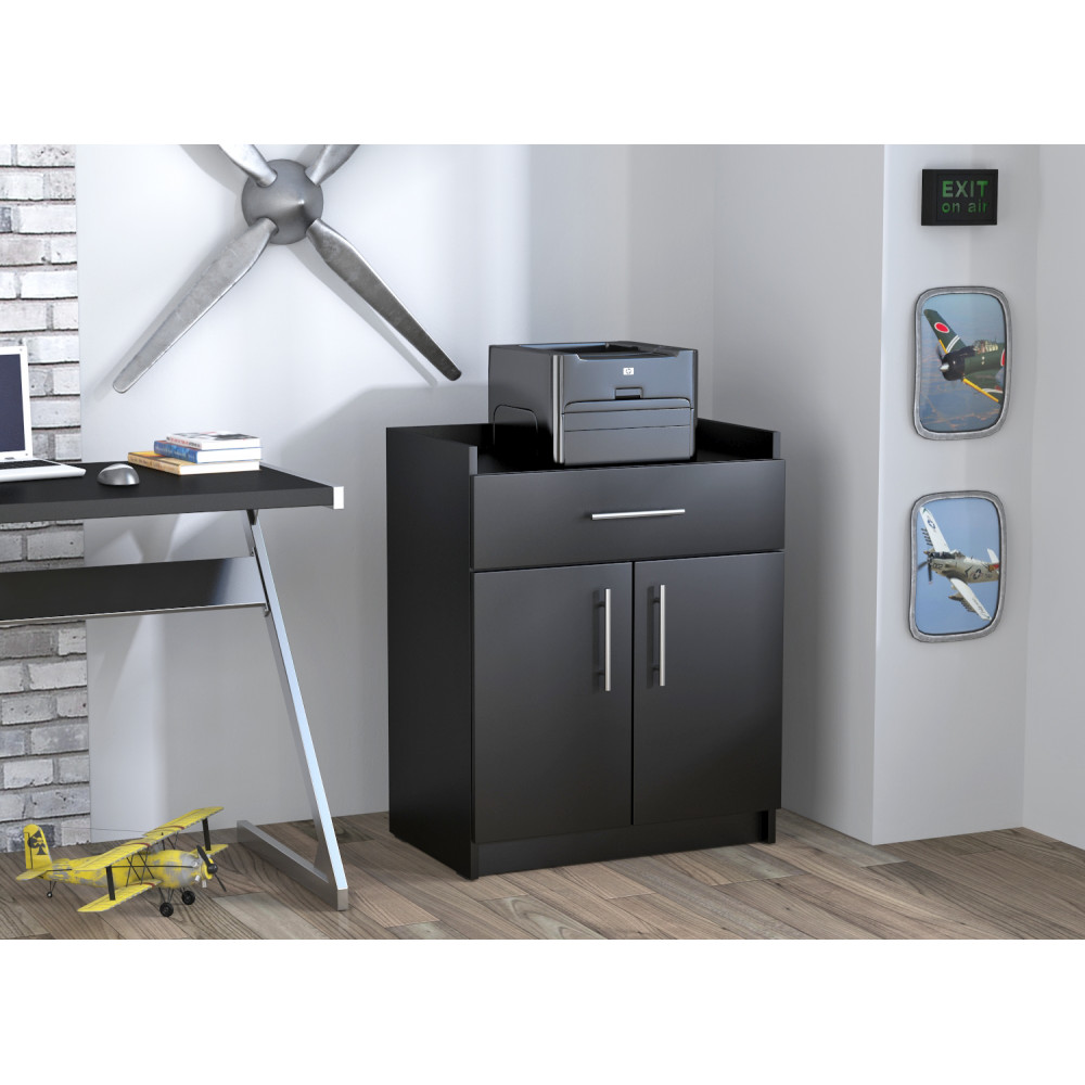 Тумба виконана з премиального ЛДСП серії Wood товщиною листа 16 мм. Краю ЛДСП проклеєні кромкою 0,5 і 2 мм на німецькому обладнанні, використання якого дозволяє якісно клеїти кромку, тим самим збільшуючи термін експлуатації виробу. В даній моделі використовуються якісні металеві рейлінгові ручки 128 мм. До нижньої частини тумби для принтера кріпляться пластикові прокладки для захисту підлогового покриття. Висувний ящик кріпиться за допомогою роликових напрямних 35 см класу Люкс. Дверцята кріпляться на металеві петлі.