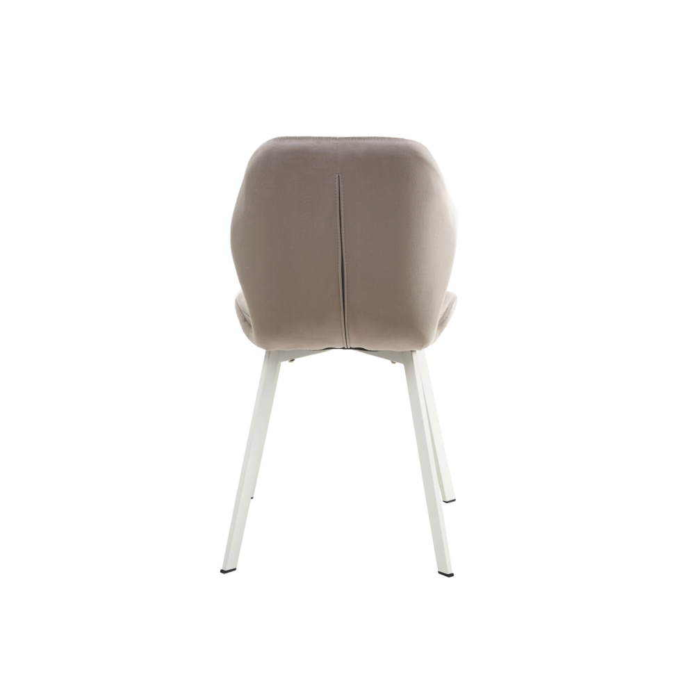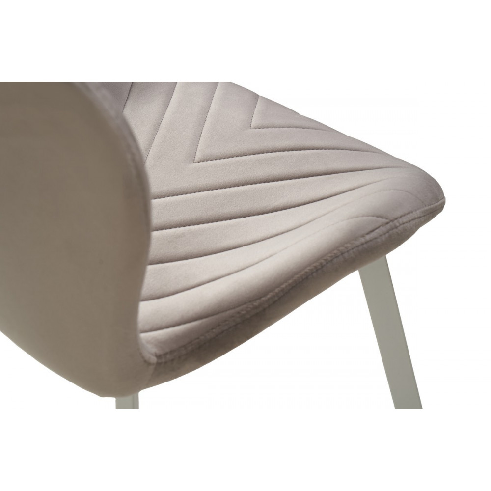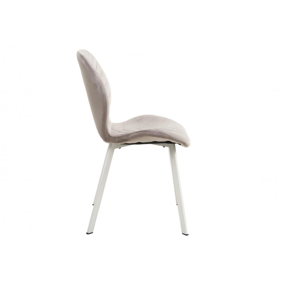 Каркас стільця виготовлений з якісного і міцного металу. Він пофарбований у білий колір, методом порошкового напилення. Завдяки такому покриттю поверхня металу має більш естетичний вигляд і тривалий термін служби. Оббивка стільця виконана з тканини велюр. У підставі ніжок встановлено пластикові заглушки, які захистять поверхню підлоги від подряпин і вм'ятин. Форма спроектована таким чином, що стілець буде максимально стійким на будь-якій поверхні, навіть нерівній. Такий матеріал приємний на дотик, довго зберігає свій первісний колір, еластичність, стійкий до потертостей і незначних механічних пошкоджень, а також легко піддається чищенню.